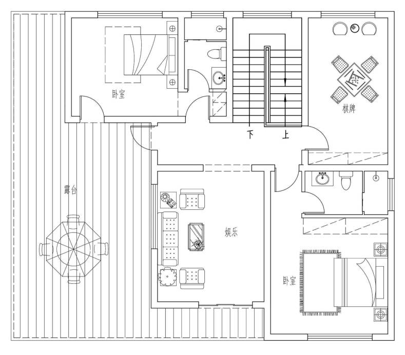 三层功能定位更偏向于娱乐活动,棋牌室和娱乐间大大丰富了建筑的活动功能,大面积露台设计则可以在平时晒晒太阳,观赏周边的秀美风景;聚会时则能用于烧烤和餐饮。在配备丰富活动空间的同时,设计师在三层还设计了两间独立客卧,用于满足平时接待亲朋好友的需要。