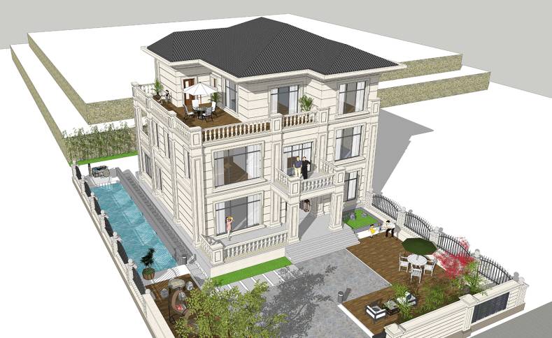 设计师将整体造型设计得错落有致,通过一层外延门厅、二层观景阳台以及三层的露台突出了立面的层次感。