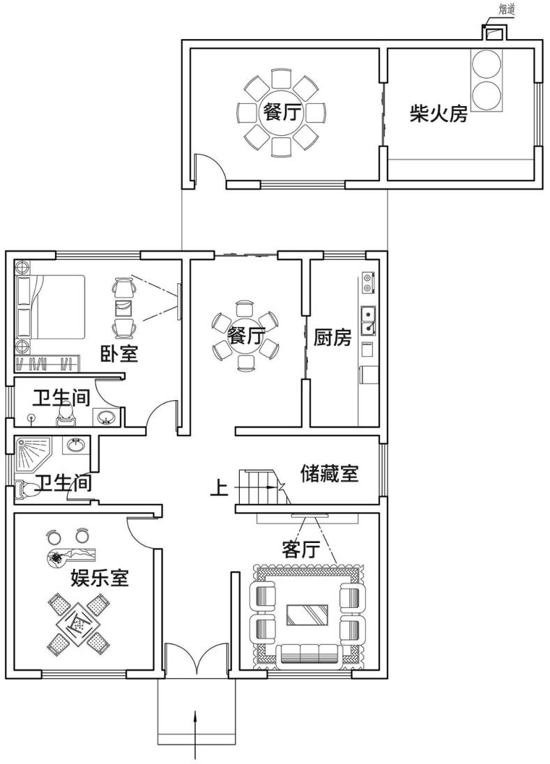 主房一层的空间功能定位更多偏向于公共活动,仅设计一间老人房,便于日常起居,避免高层攀爬带来的困扰。