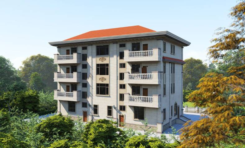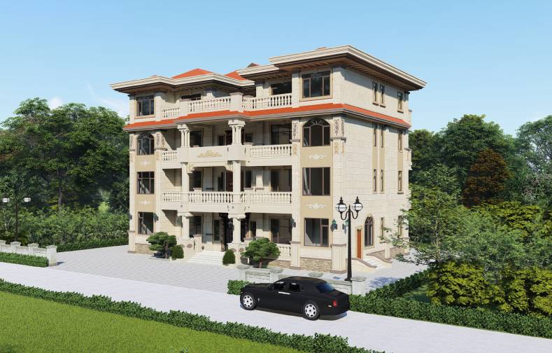 三、四层挑出去的阳台与一层入户门上下相连,形成门厅空间,搭配庭院绿植景观,后期再配置休闲桌椅,突出建筑整体的层次感。